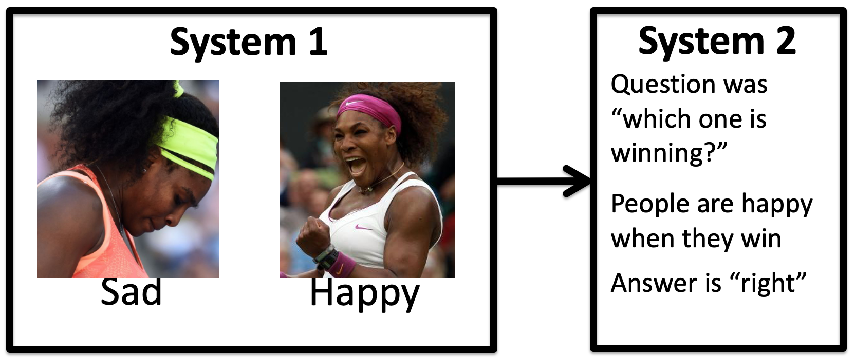 Most of the time this works well. For example, when judging the pictures of Serena Williams, System 1 makes a guess at her emotions quickly and automatically. This information is then passed to System 2 which can make the judgment about which one is a picture of her winning.