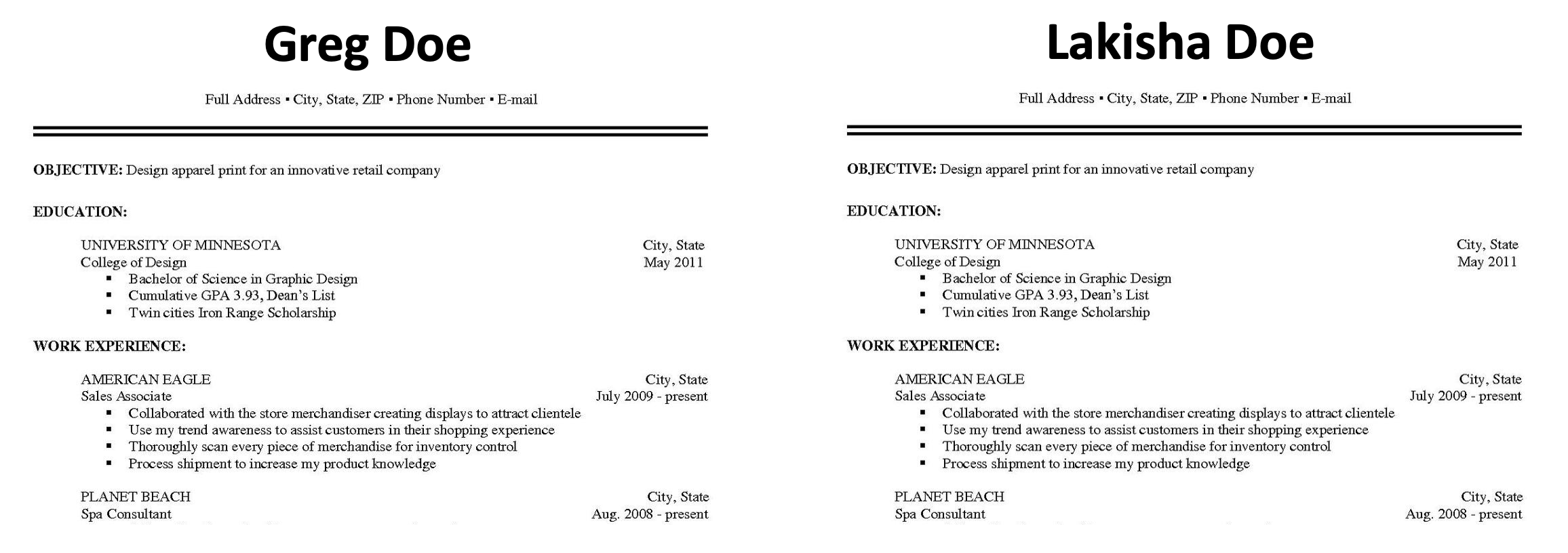 The idea was simple, they sent out applications for a bunch of jobs. The applications all had the same information (same resume, cover letter etc …) but differed in one feature, the name of the applicant. These names were either white sounding names (Greg and Emily) or African American sounding names (Lakisha and Jamal). So the resumes might look like this …