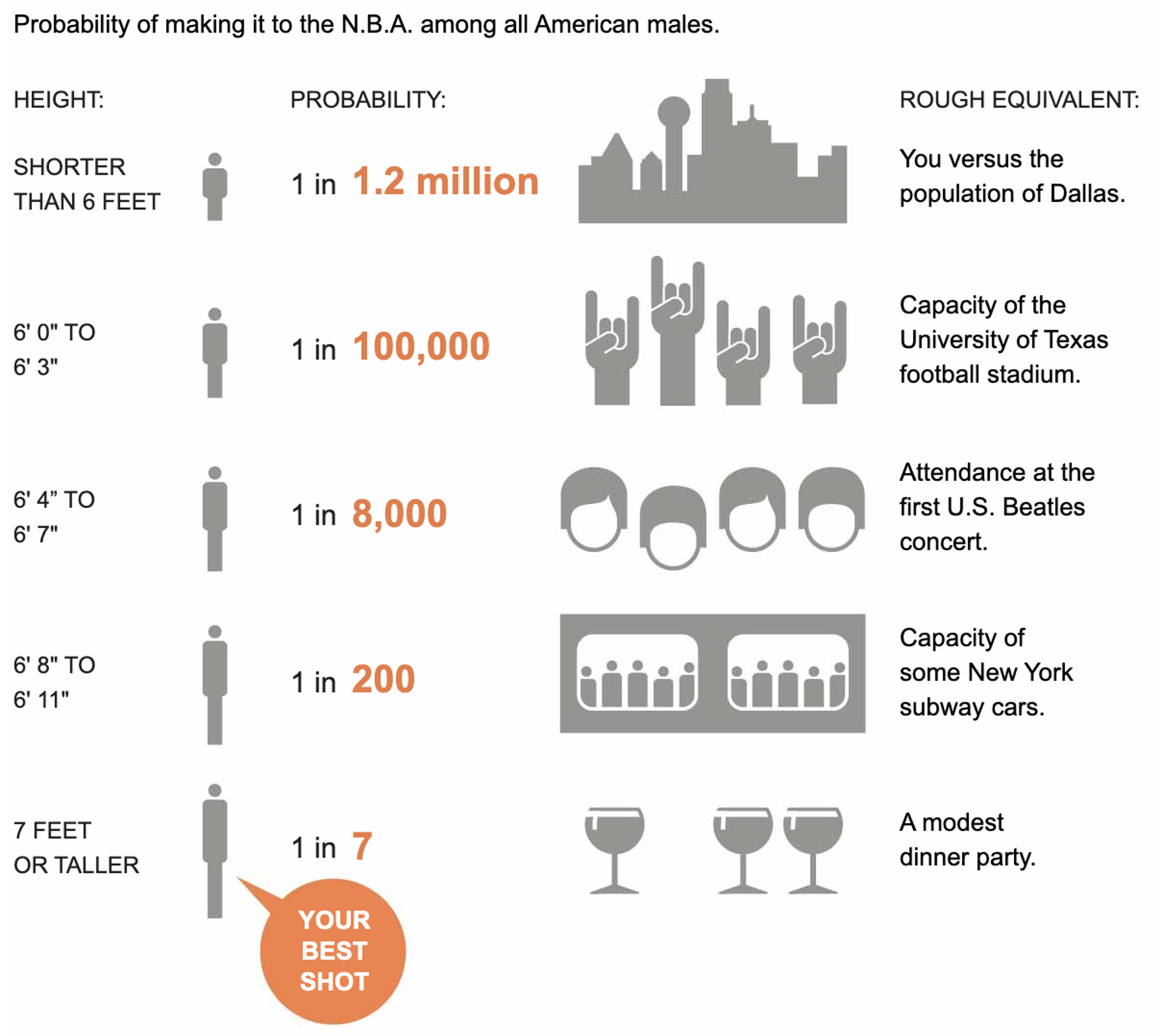 In case you’d like to know your own odds of playing in the NBA, the New York Times made this graffic (full story here). Sadly they didn’t make a similar chart for women, but height helps here too with the average WNBA player being over 6 feet.