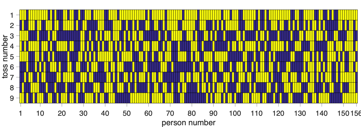 Here are the results. In this plot, I’m plotting the people on the x-axis and toss number on the y-axis, heads are coded in yellow and tails in blue. So the rectangle in the top left corner corresponds to the first imaginary coin toss of the first person to complete the survey. In this case the rectangle is yellow so they said heads.