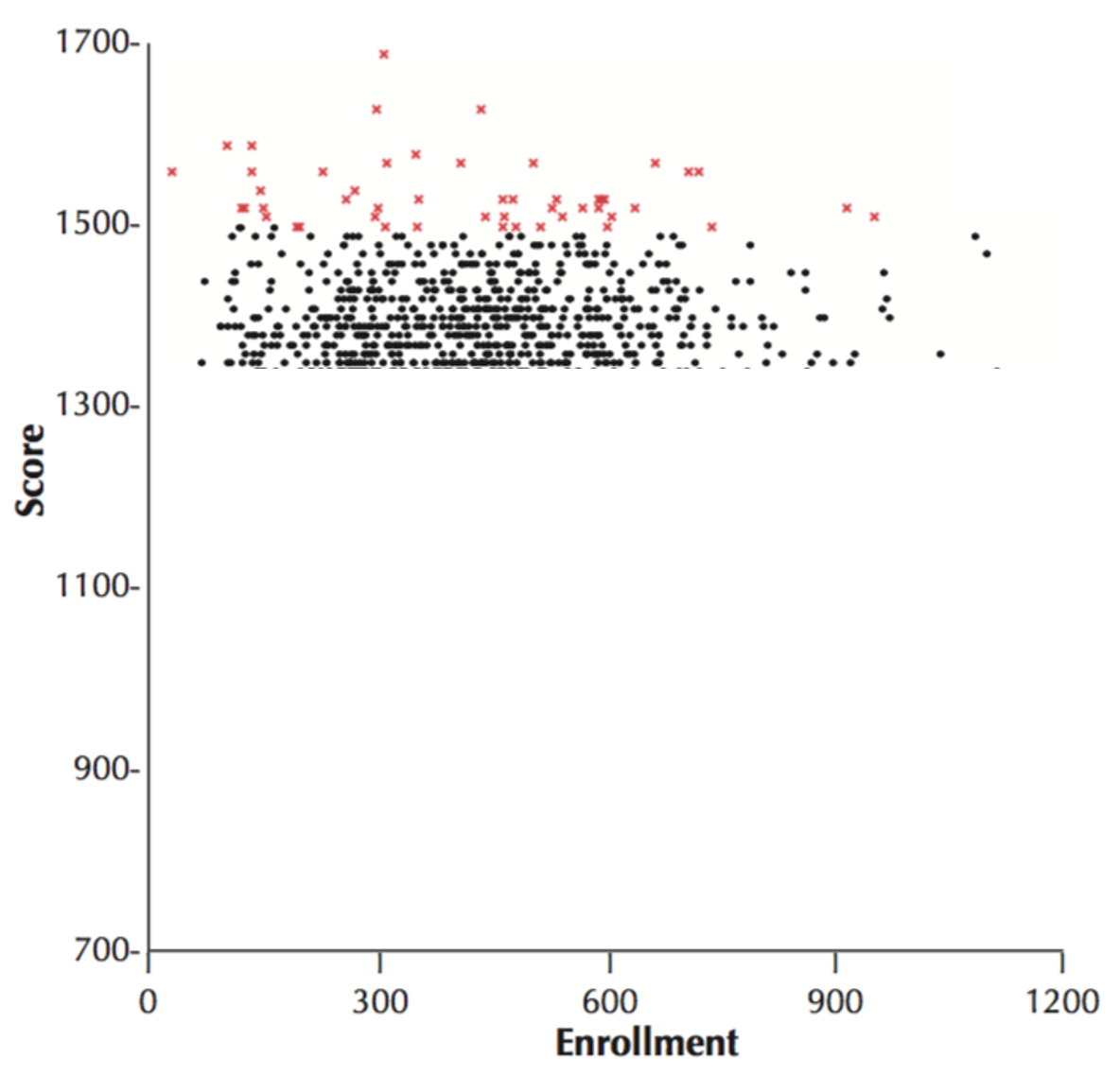 These top scoring schools tend to be on the smaller than average, so from this we would conclude that smaller schools are better than larger schools. Indeed, intuitions like this can become political very quickly and politicians can propose things like closing big schools in favor of more smaller schools.