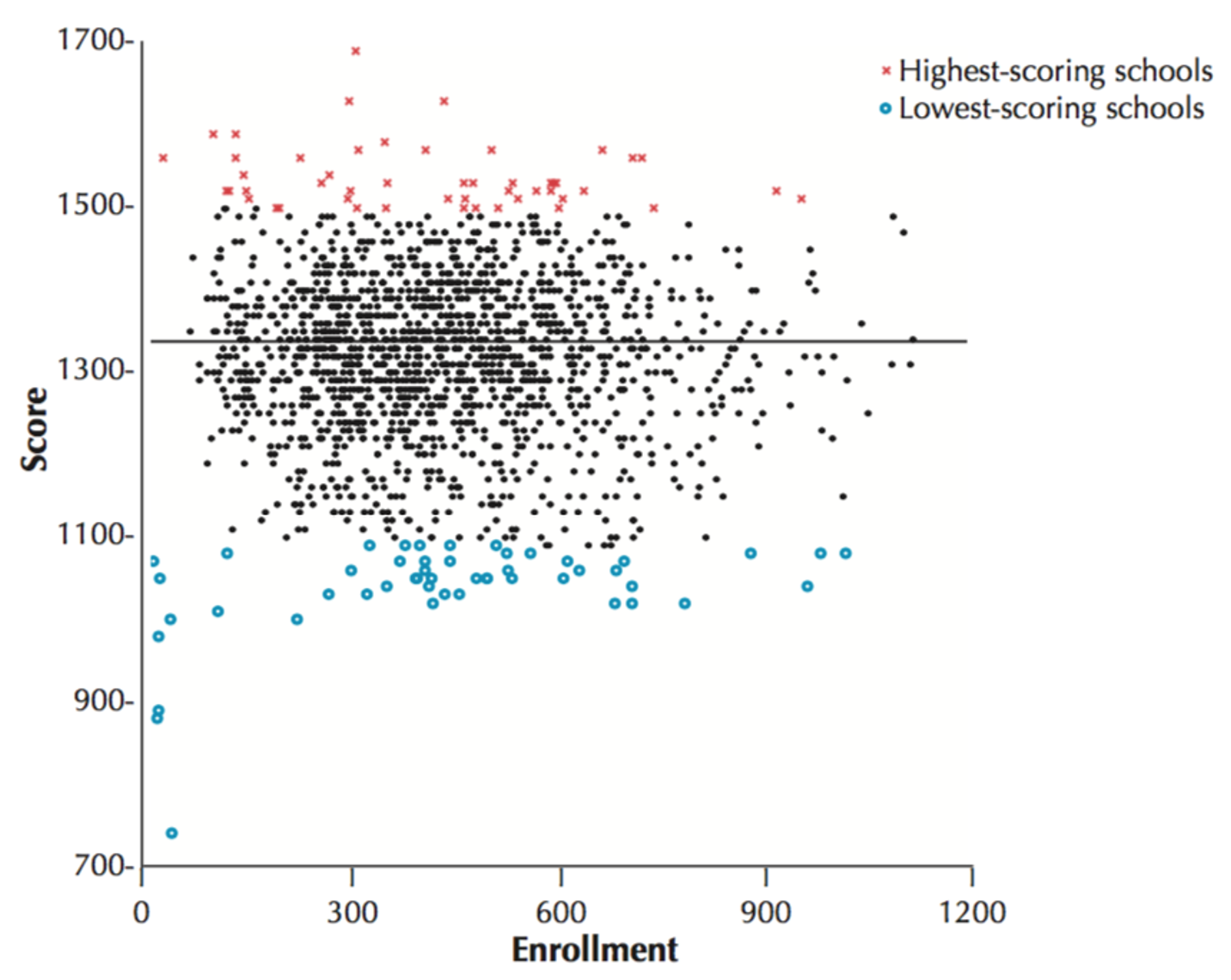 Why? It’s the Law of Small Numbers yet again. Small schools, by definition, have smaller numbers of students and so we’d expect more variability in their average test scores simply by chance.