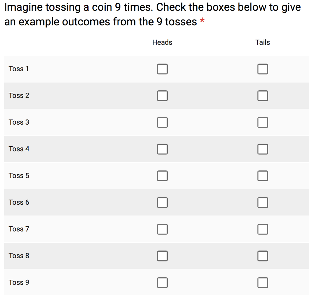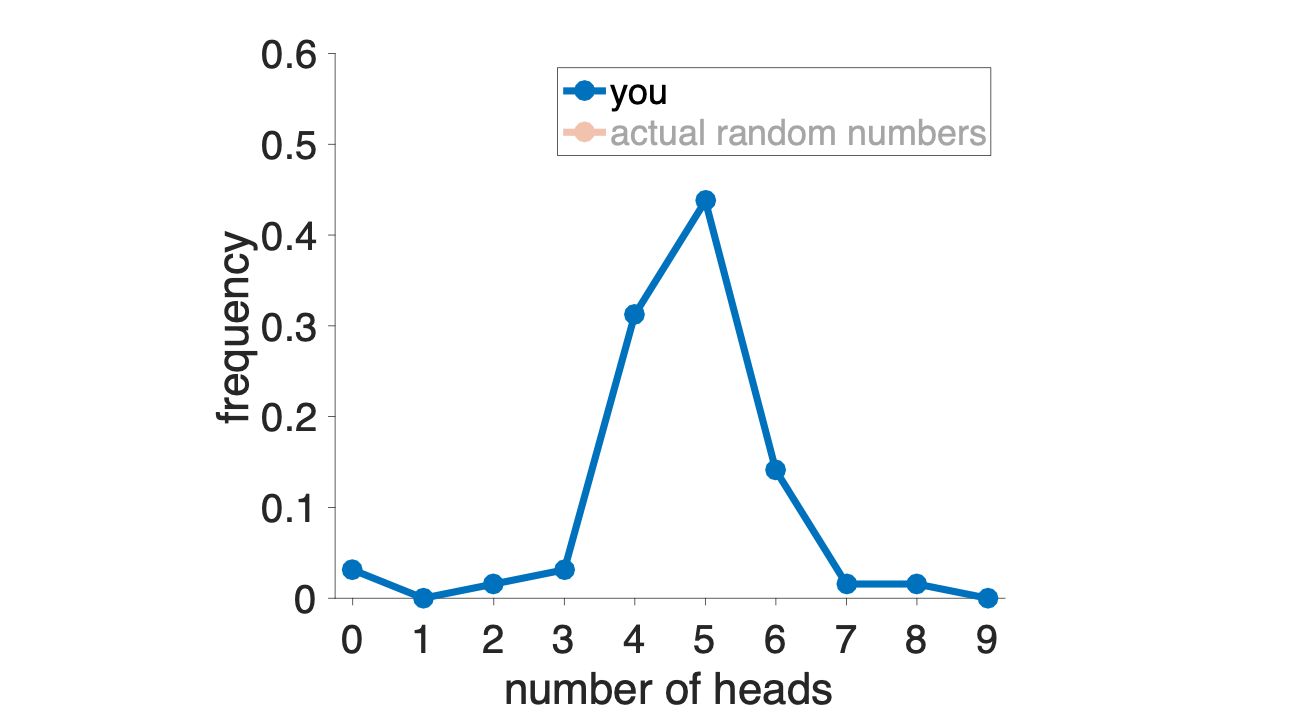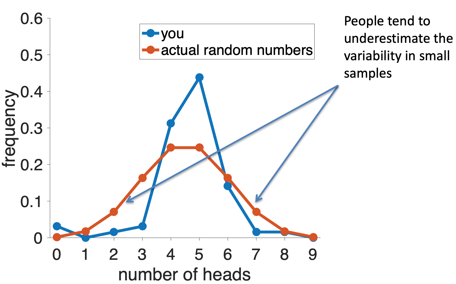 In particular, when I ask you imagine 9 “random” coin tosses, instead of reporting something which could happen (e.g. 7 tails and 2 heads), you report something that is representative of what you think randomness looks like. For a fair coin, this is roughly equal amounts of heads and tails.