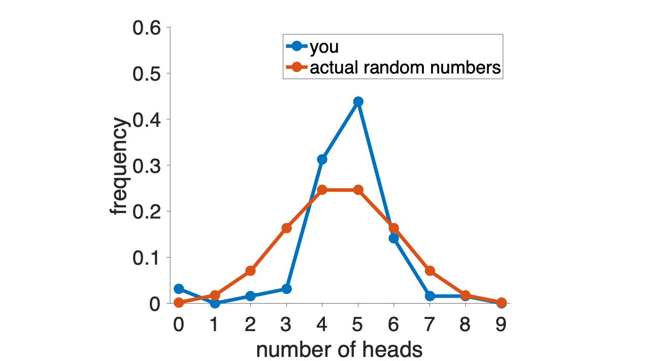 Real random coin tosses, especially when there are only a small number of coin tosses, are more likely to have low and high numbers of heads than “random” coin tosses that are generated by people.