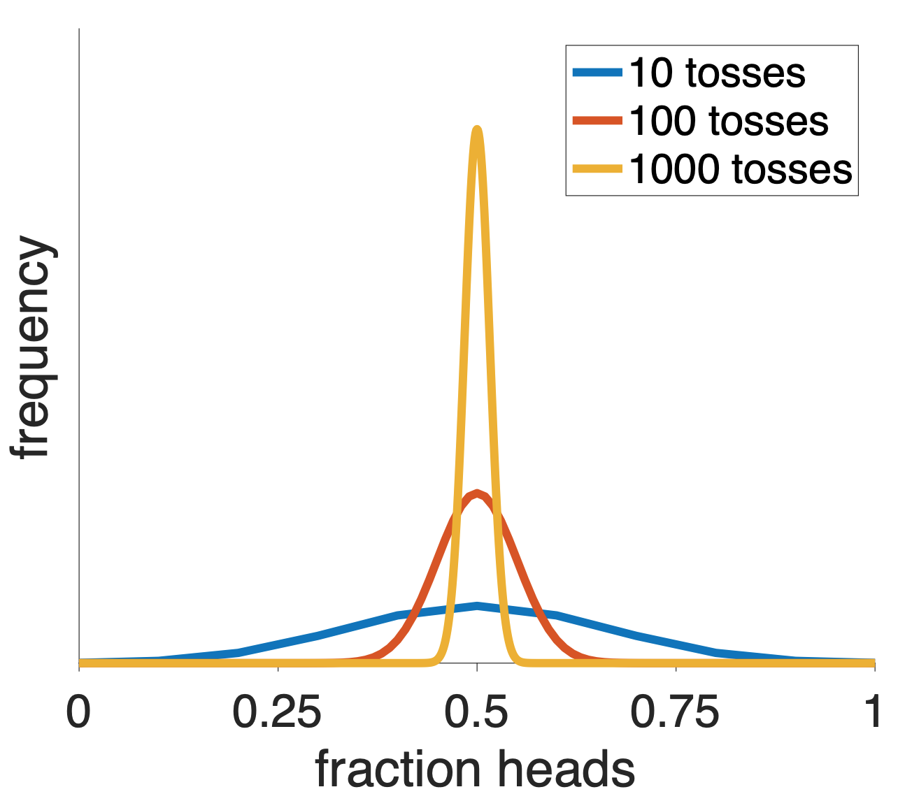 If you’d tossed more coins, your distribution over the fraction of heads would have been closer to the truth. This is because when you have a large number of tosses of a fair coin, then it’s hard for the fraction of heads to get far from 50%, this is because of a mathematical fact (the law of large numbers).