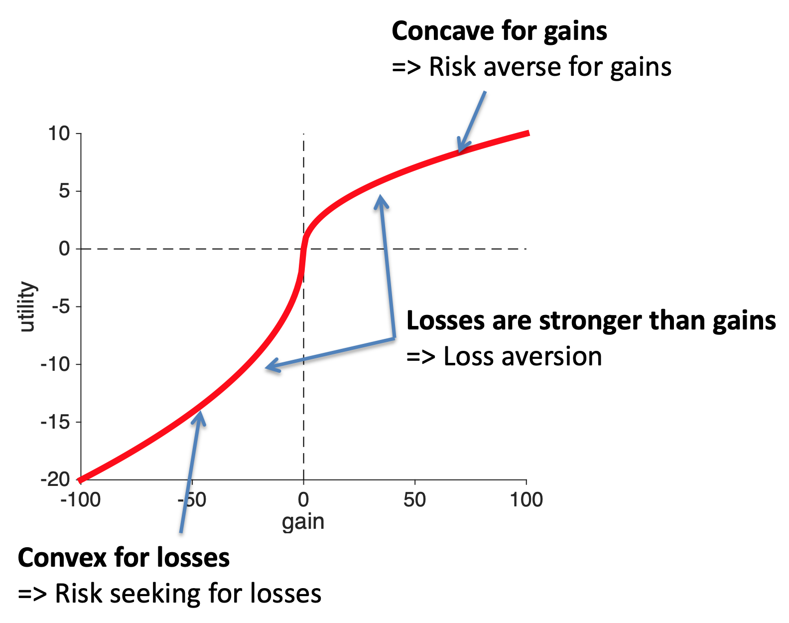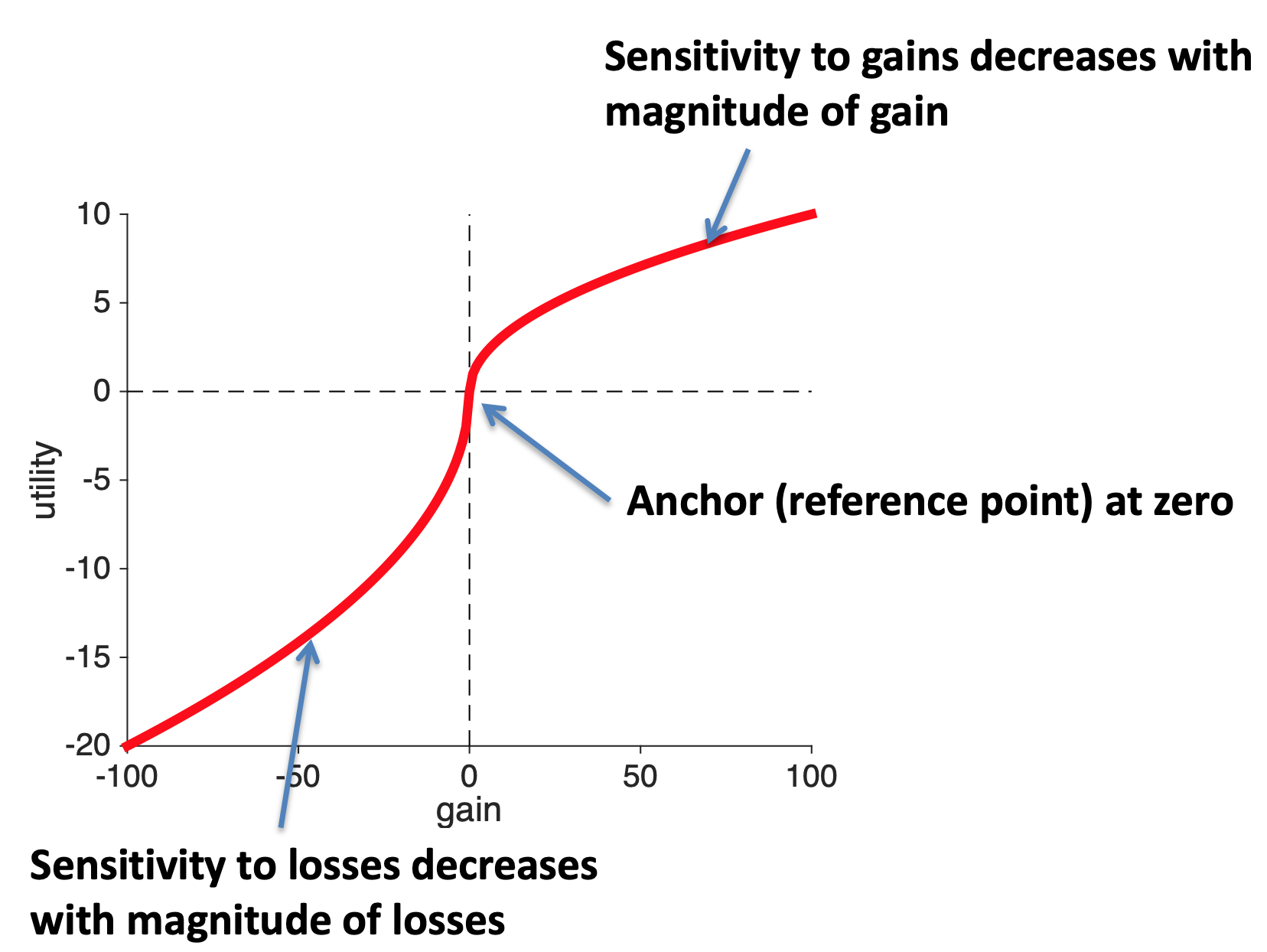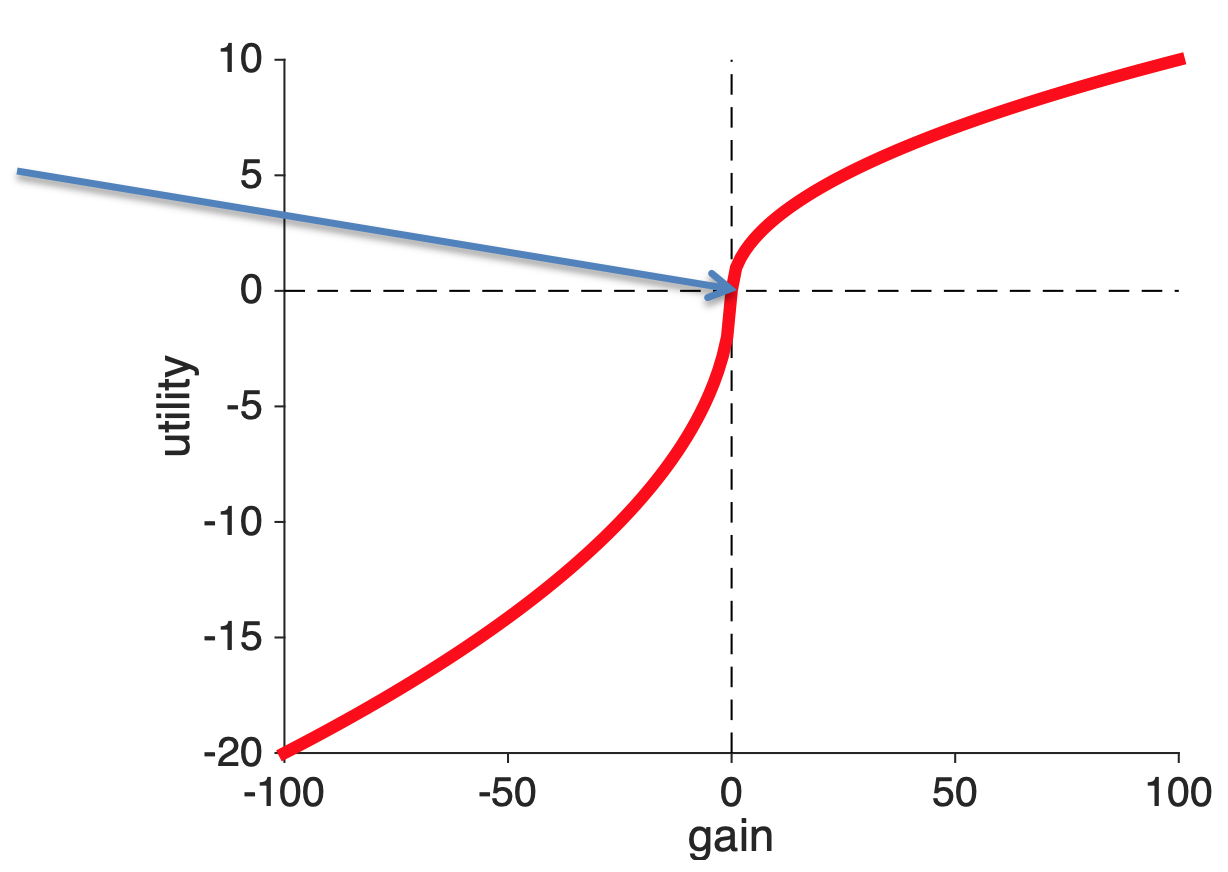 So these Psychological insights can get us two out of three properties of the utility curve. The only thing they can’t explain is the relative strength of gains and losses. For that we need the experiment we discussed last time.