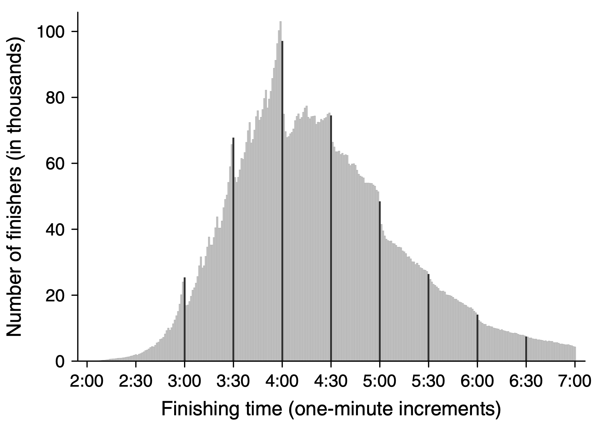 They were interested in whether they could see evidence for reference points in people’s marathon finishing times. They could. In particular, when they plotted the distribution of finishing times they saw clear bumps on the hour and half hour …