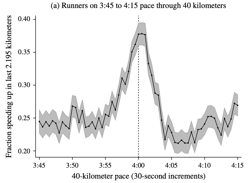 In fact, a more detailed dive into the data shows that people actually speed up in the last two miles if they think they can get under the milestone. Here’s data for the four-hour runners.
