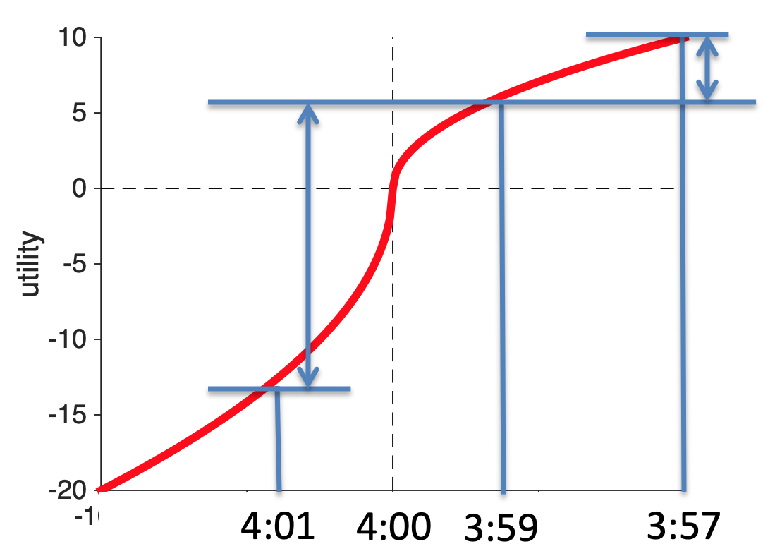 Now let’s imagine I’m on for a 4:01 finishing time, if I could speed up and cut 2 minutes off my time, my increase in utility would be huge. I go from 4:01 to 3:59 and I’m a sub-4-hour marathoner!