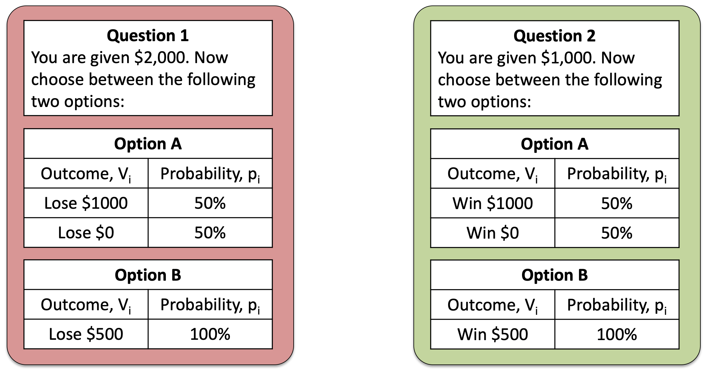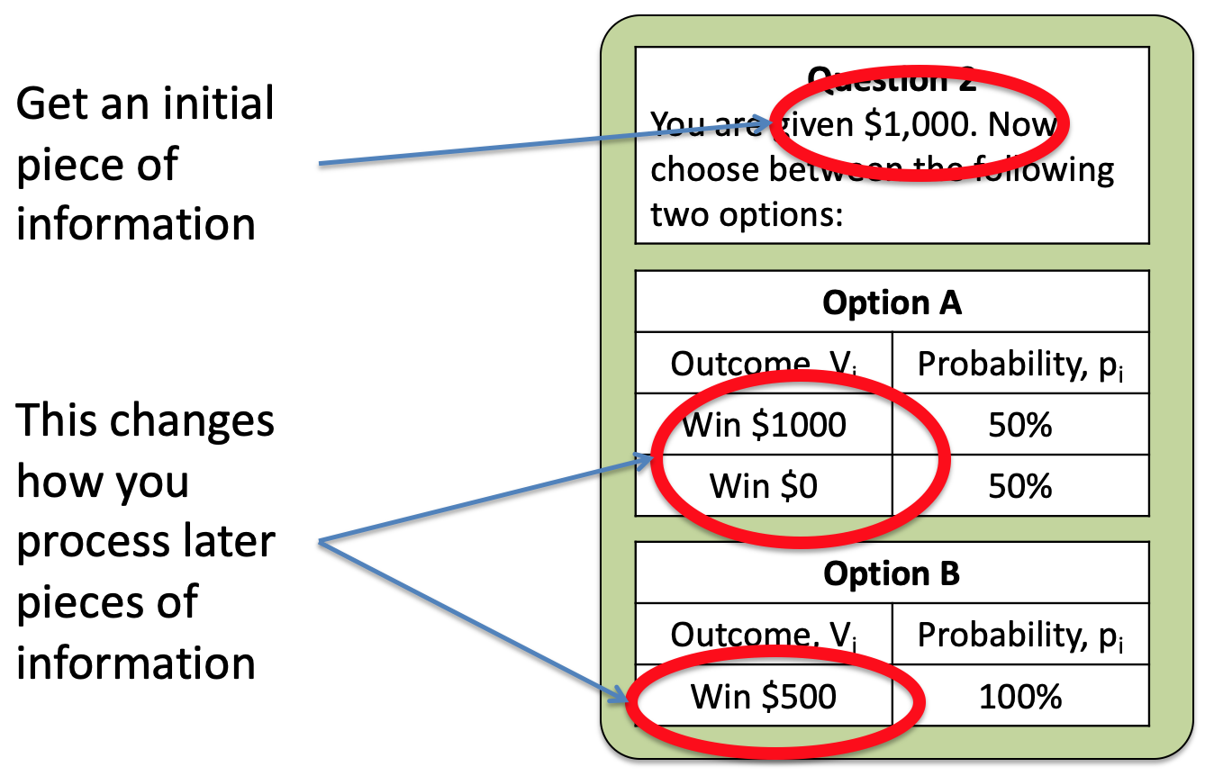 Today, we’re not going to think so much about the behavior on these questions. Instead we are going to think about the structure of the questions themselves. In particular, both questions start with a reference value ($2,000 or $1,000) and then show you the possible outcomes of the gambles.