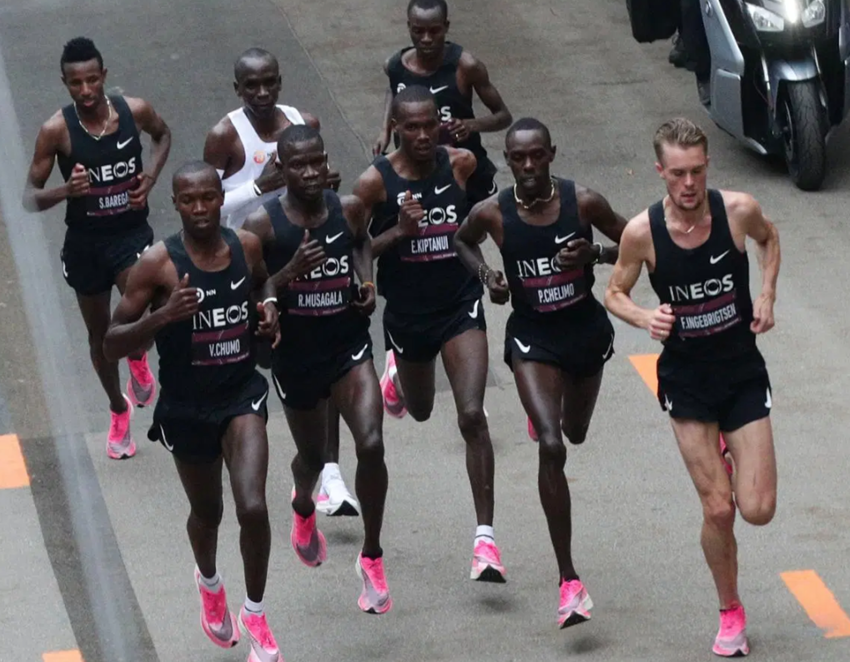 In addition to fancy shoes, a carefully selected course and perfect weather conditions, he also had a team of 43 pacemakers to help set the pace and run in a crazy formation to reduce wind resistance! These pacemakers included several Olympians including the 1,500 meter Olympic gold medalist (Matthew Centrowitz), the 5,000 Olympic silver medalist (Paul Chelimo).