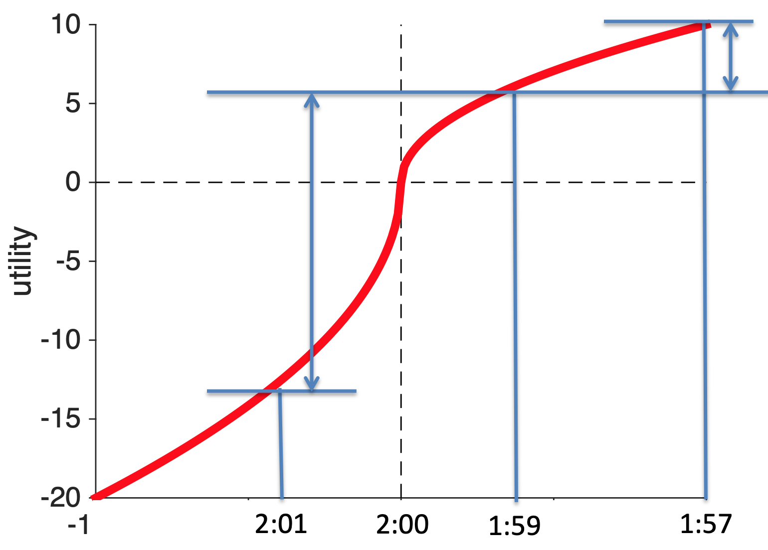 Contrast that with the same increase in speed for someone who’s already on for 3:59. For them going 2 minutes faster and scoring 3:57 increases utility a bit, but it’s hardly anything to brag about because you haven’t broken the arbitrary reference point.