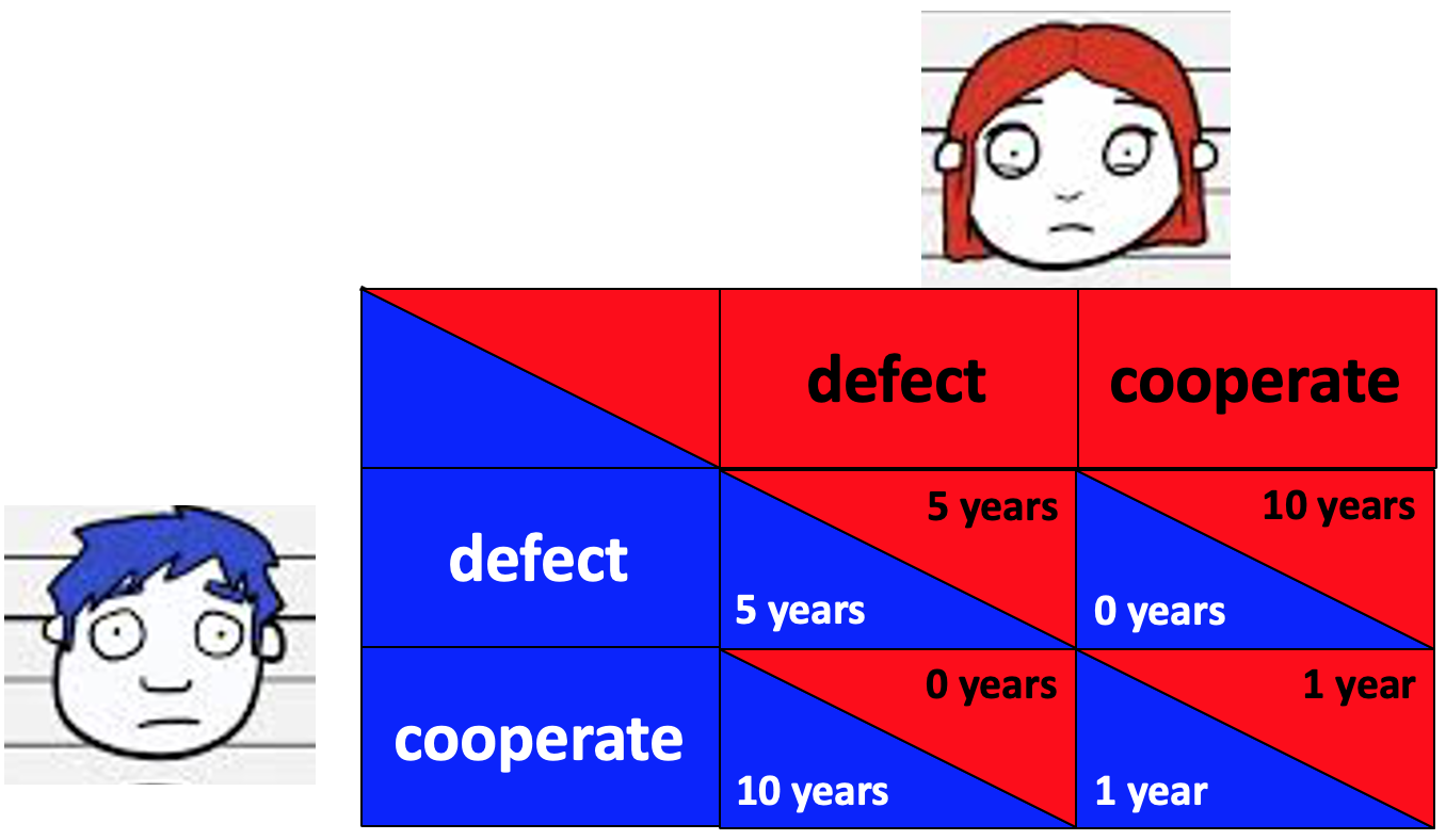 Once you get used to reading these matrices, you can easily see that if they both choose to defect they both get 5 years. Or if Blue defects but Red cooperates then Blue gets 0 years and Red gets 10 years, etc …