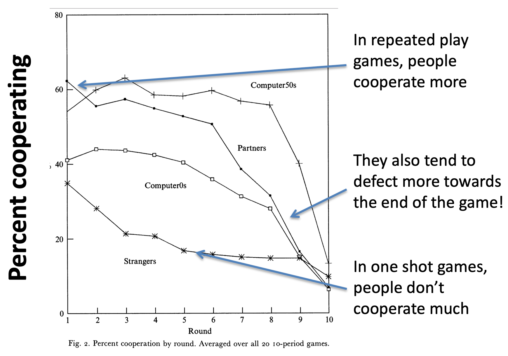 In the Partners condition, people cooperated much more (60% of the time), especially at first. Interestingly, on the very last play people were likely to defect, which makes sense because this is identical to a repeated play game.