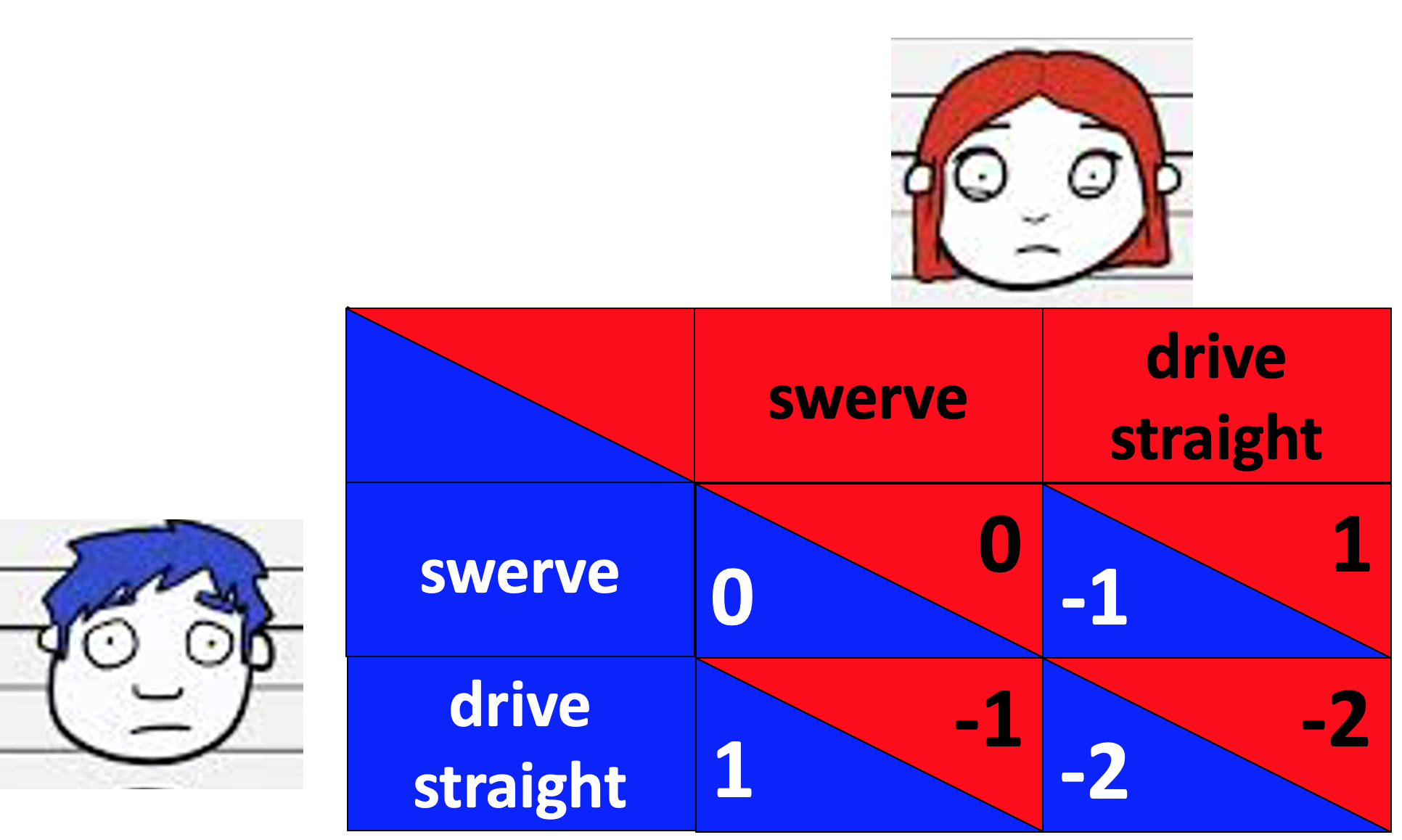 Clearly this is a crazy game, but it turns out that it captures many real-world situations. But before we get there, let’s write down the payoff matrix for Chicken. For simplicity, we’ll put a numerical cost on being called a chicken (-1 points), a reward for winning (+1 point), and a numerical cost on driving over the cliff (-2 points, probably an underestimation!)