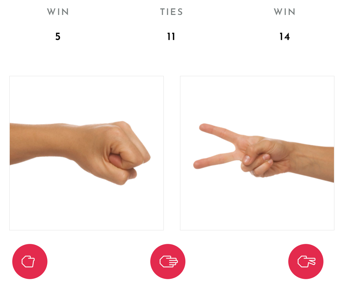 In fact, the lose-shift bias is even more predictable than switching randomly. People actually appear to be biased towards a cycle of Rock \(\rightarrow\) Paper \(\rightarrow\) Scissors \(\rightarrow\) Rock! So if they just lost playing Rock they switch to Paper, and if they just lost playing Paper they switch to Scissors etc …