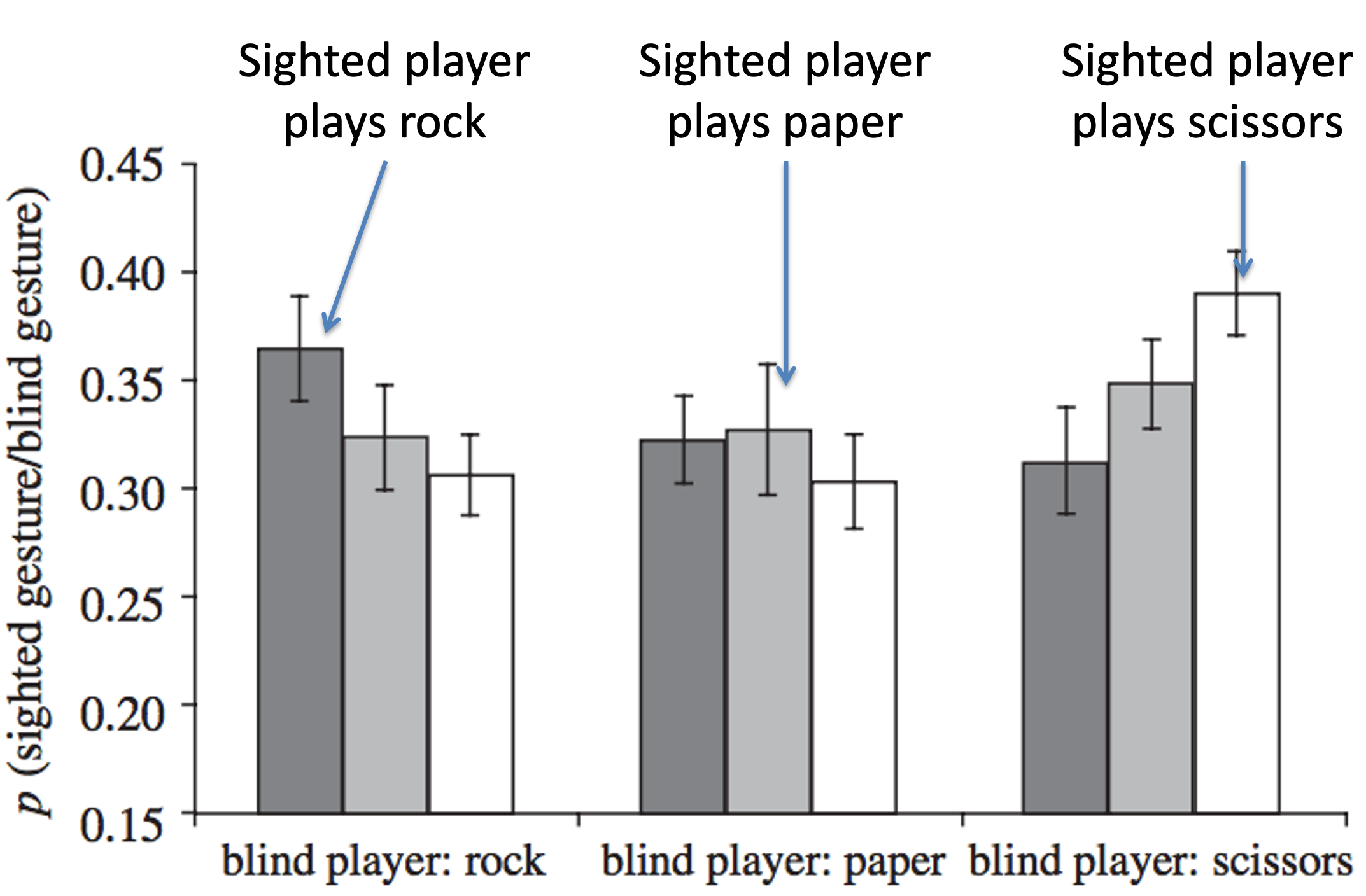 On the x-axis is what the blind player player. You can see the evidence of copying here (especially for Rock and Scissors) … for example, when the blind player plays Rock the dark bar is highest corresponding to the sighted player being more likely to play Rock.